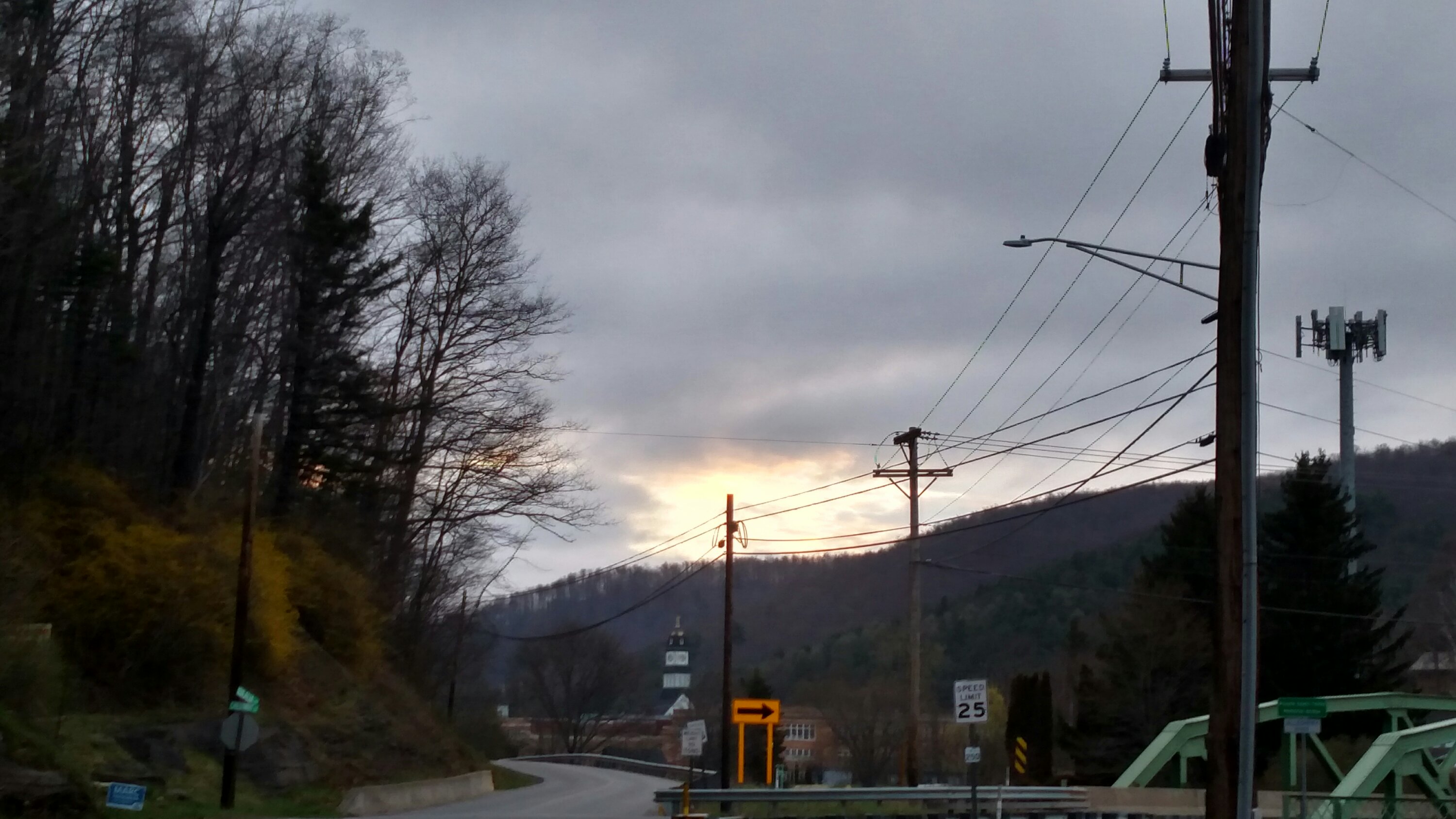 It was almost 100% cloudy when I headed out but there was a small break in the clouds in the direction the sun would be peaking up. I had decided to head up this big hill just outside of town…kinda steep, but a nice quiet dirt road with a view of the town and a chance to see the sun rise over the opposing mountains. I knew if I was going to catch a sunrise this morning, this was my best chance.