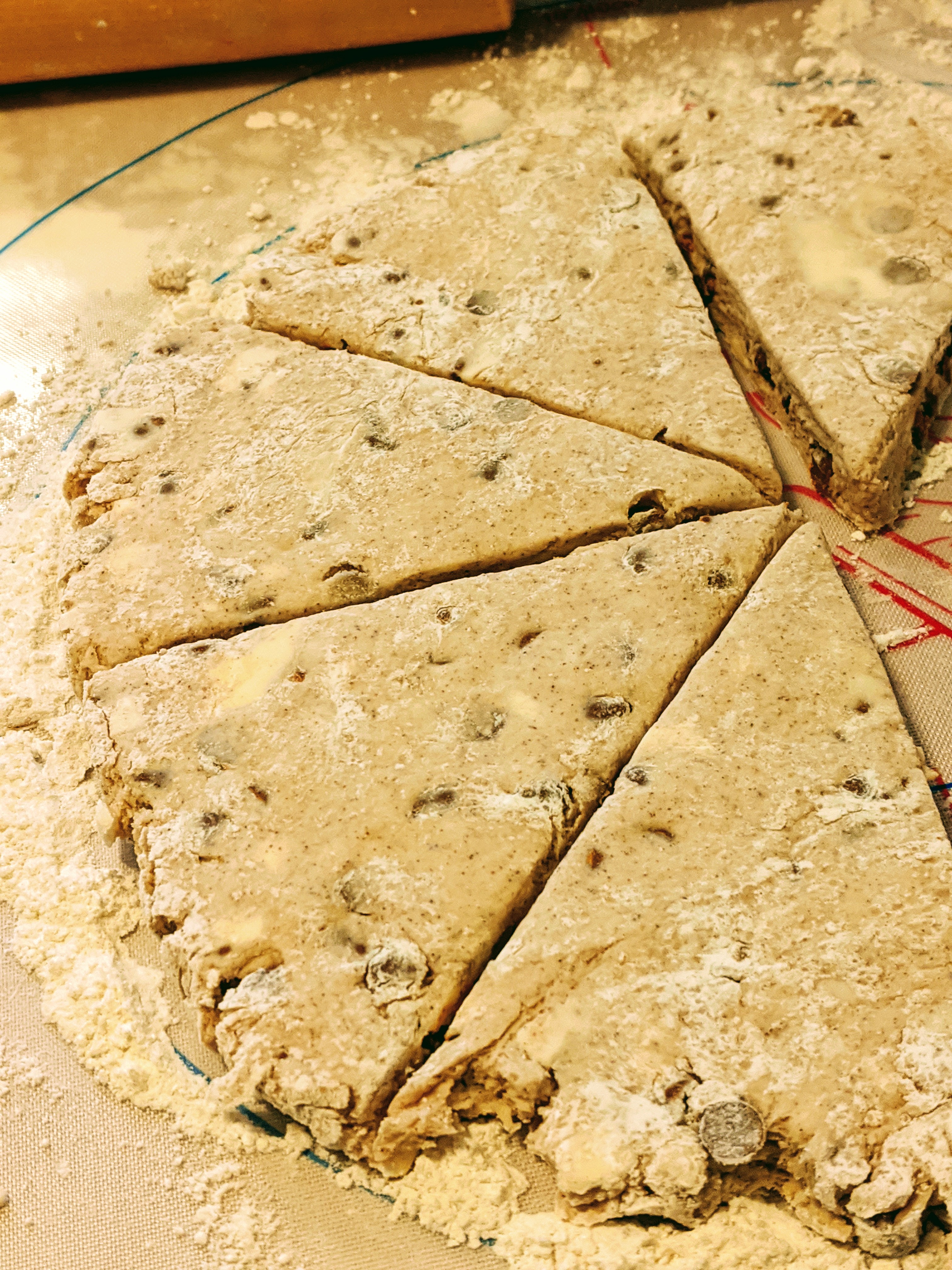 Transfer dough to floured countertop and knead dough by hand until it forms a ball. Pat the dough into a circle, roll it out to approximately 3/4″ thick. Cut scones into triangles (x8).