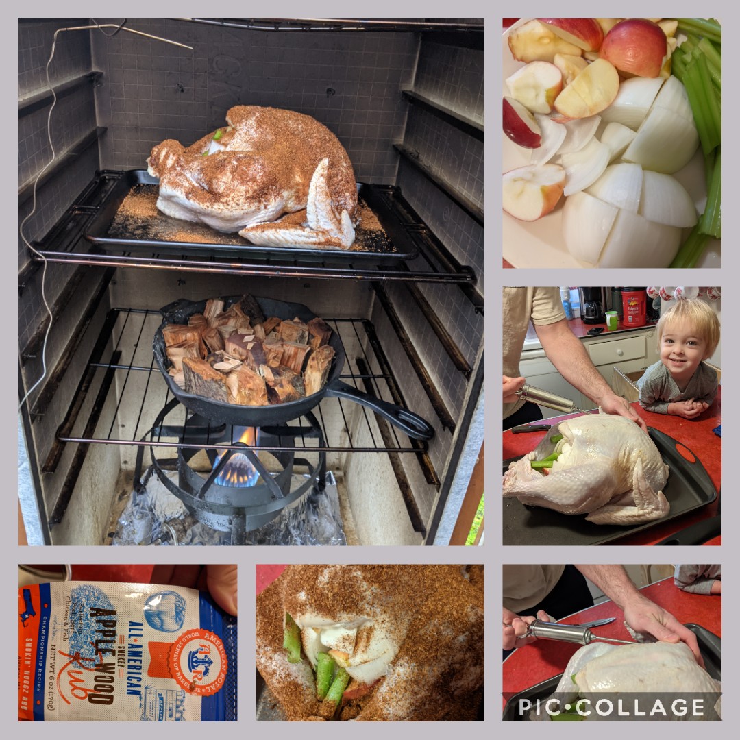 Everyone knows I like to run, but cooking/baking can create that same relaxed, carefree, enjoyable feeling for me too (*if the stars align and the kids all play nicely and let me cook in peace, that is). I really enjoy cranking some good music and creating some tasty food, with a lil dancing around the kitchen, and an occasional squeeze to my hubby…he can tell when I’m enjoying myself cooking and likes the mood it puts me in! Anyway, I saw a glimpse into our future today and it made me smile. I always remember my grandma and grandpa cooking Thanksgiving dinner together; today my hubby and I made a pretty awesome team, creating a delicious Thanksgiving dinner. I helped him prepare the turkey for the smoker (totally his show- he does an awesome job). He prepared a brine and soaked it for 24+ hours, then prepared a flavorful solution he injects it with, we stuffed it with aromatics (celery, onion, and apples), and then he finished it with a rub (a combination of his homemade AP rub and a store bought apple rub). When he smokes something, it’s always out of this world, full of flavor!
