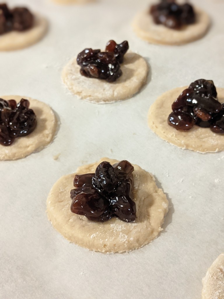 The dough is a sweet sugar cookie like dough, very sticky consistency at first. The raisin filling gets cooked on the stove top and then carefully sandwiched between two cookie dough rounds. The Brown Eyed Baker said they’d self seal and no need to pinch shut but being the old school cookie that they were, I pictured my friend’s ‘Gigi’ crimping them shut with a fork, so that is what I did.